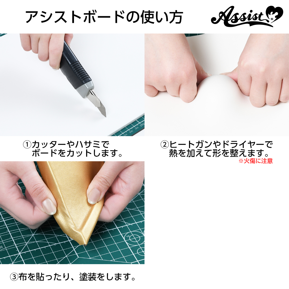 ・Weapons, protective gear, accessories, etc. that express the texture of metal and leather can be produced by pasting a board and elastic fabric or synthetic leather together with a rubber-based adhesive.