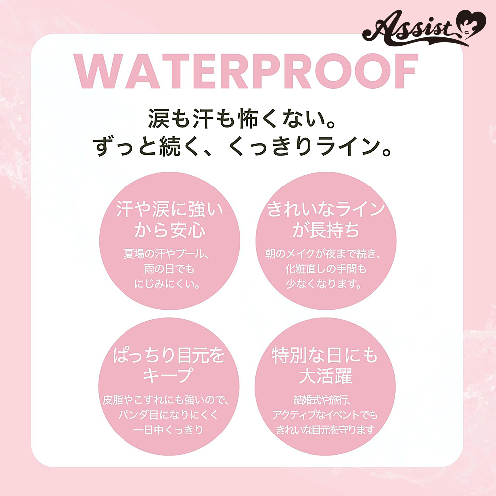 Waterproof and resistant to water, sweat, sebum, and abrasion.